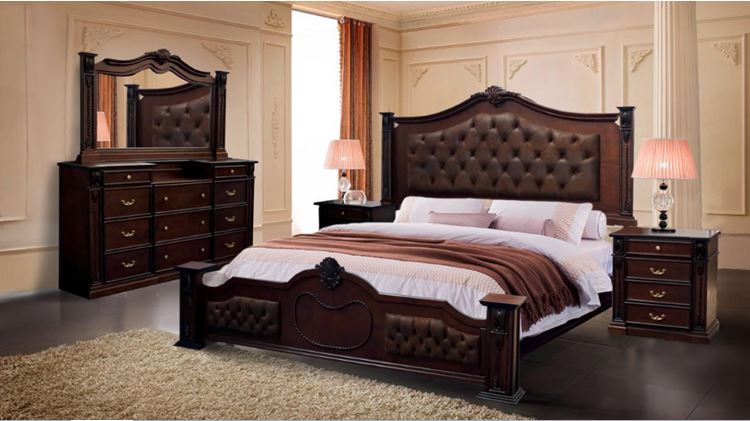 RECAMARA CLASICA EN MDF ENCHAPADO COLOR NOGAL CON APLICACIÓN DE POLIURETANO CABECERA 2.46X1.80X10CM FONDO CAPITONADA CON VINIL, 2 BURO 80X84X44CM FONDO C/4 CAJONES, TOCADOR CON LUNA 1.80X2MX45FONDO C/11 CAJPONES, PIECERA 2.55X68CMX26CM FONDO CAPITONADA